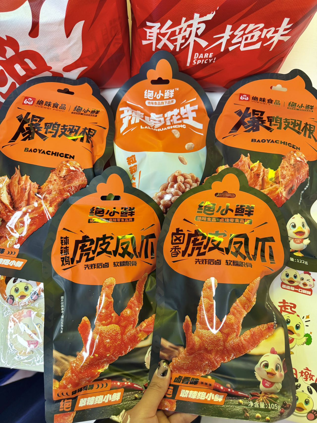绝小鲜精准锚定年轻群体“社交式消费”“情绪解压” 需求,推出受众甚多的虎皮凤爪系列、爆·鸭脖以及甜辣海带片等 10 余款 SKU,单包价格亲民,覆盖追剧、夜宵、通勤等高频场景,做年轻人随时随地撕开即享的解馋搭子,实现从“味觉满足” 到 “情绪价值” 的跨越。
